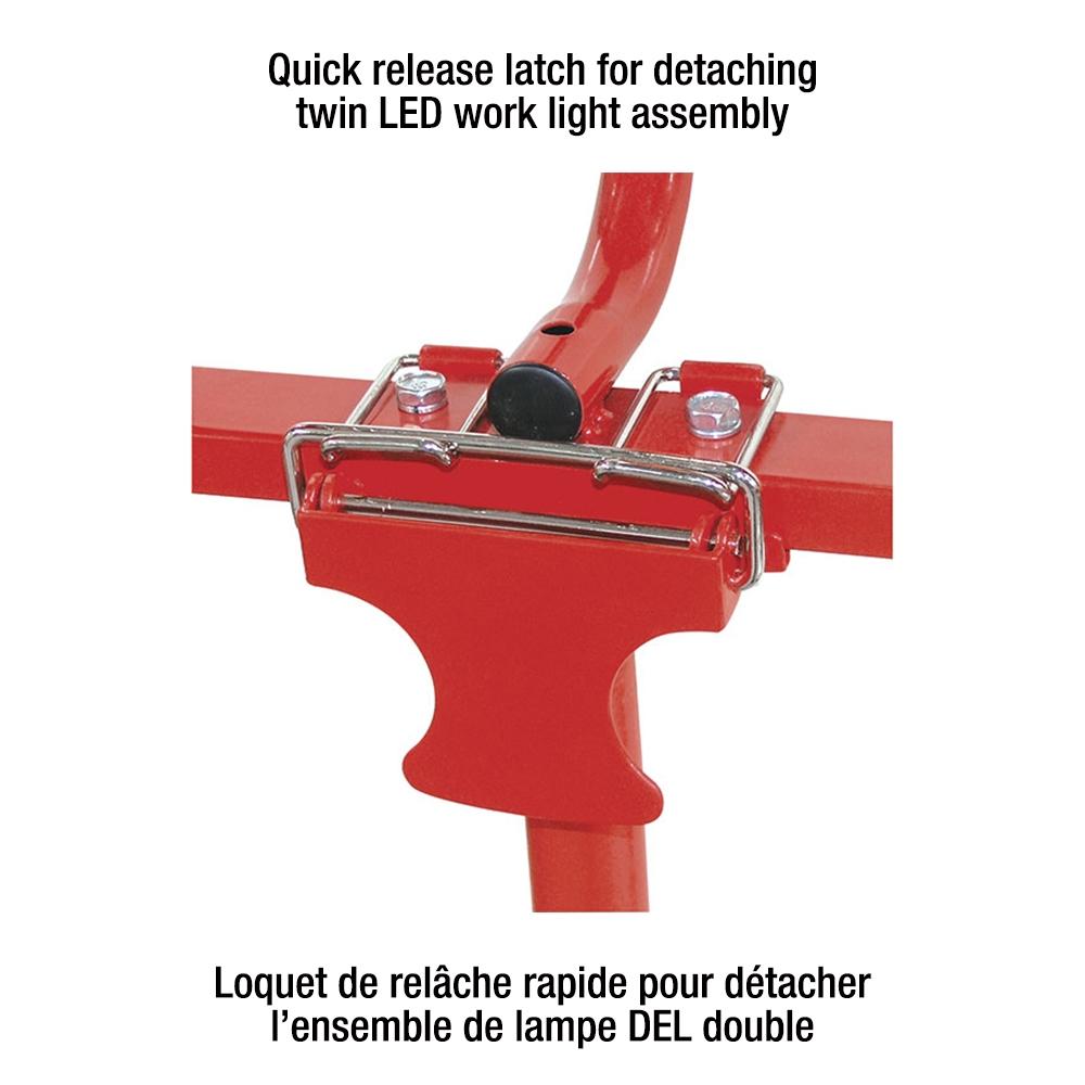- Height adjustable tripod with quick release latch for detaching twin LED work light assembly